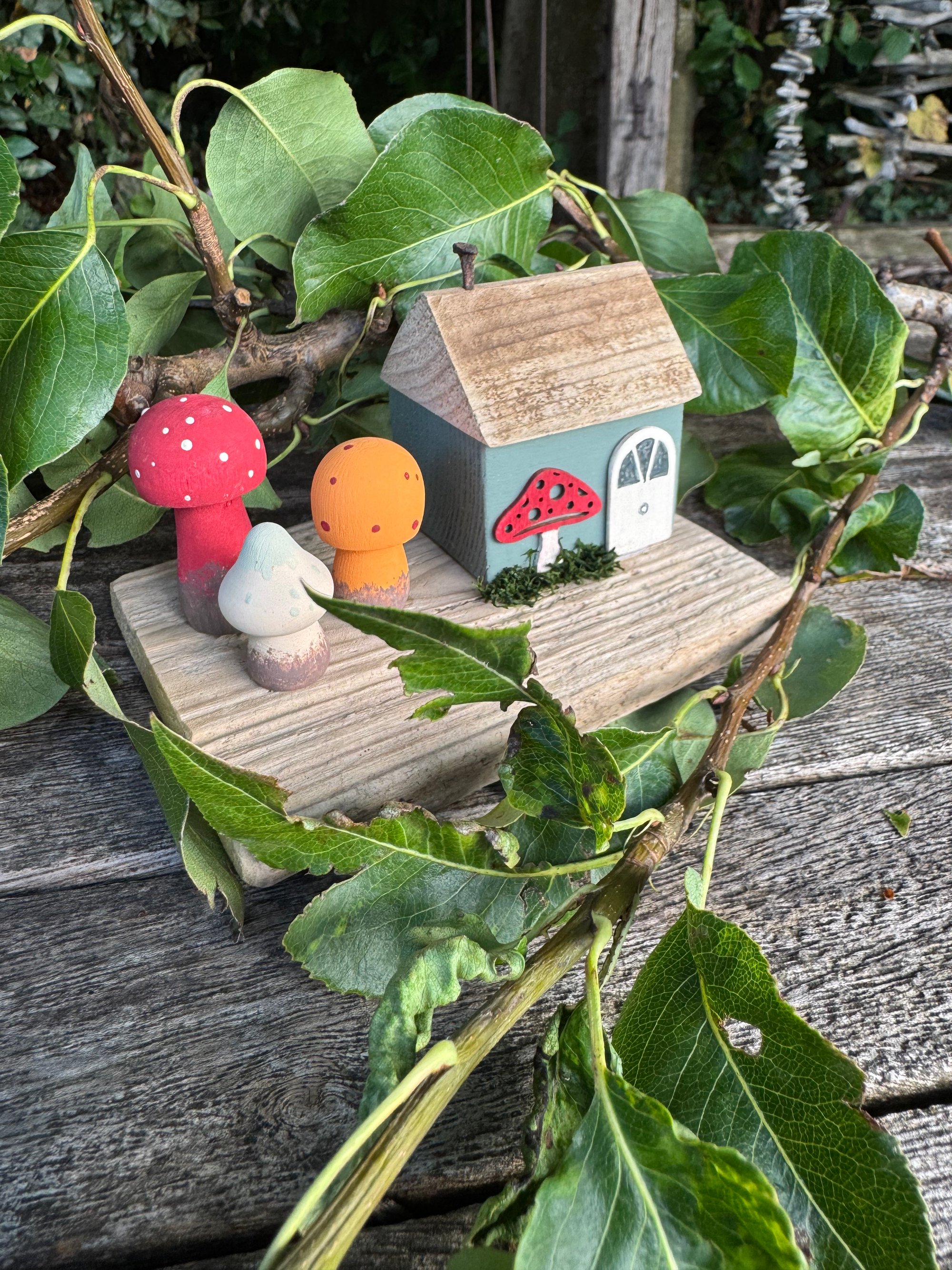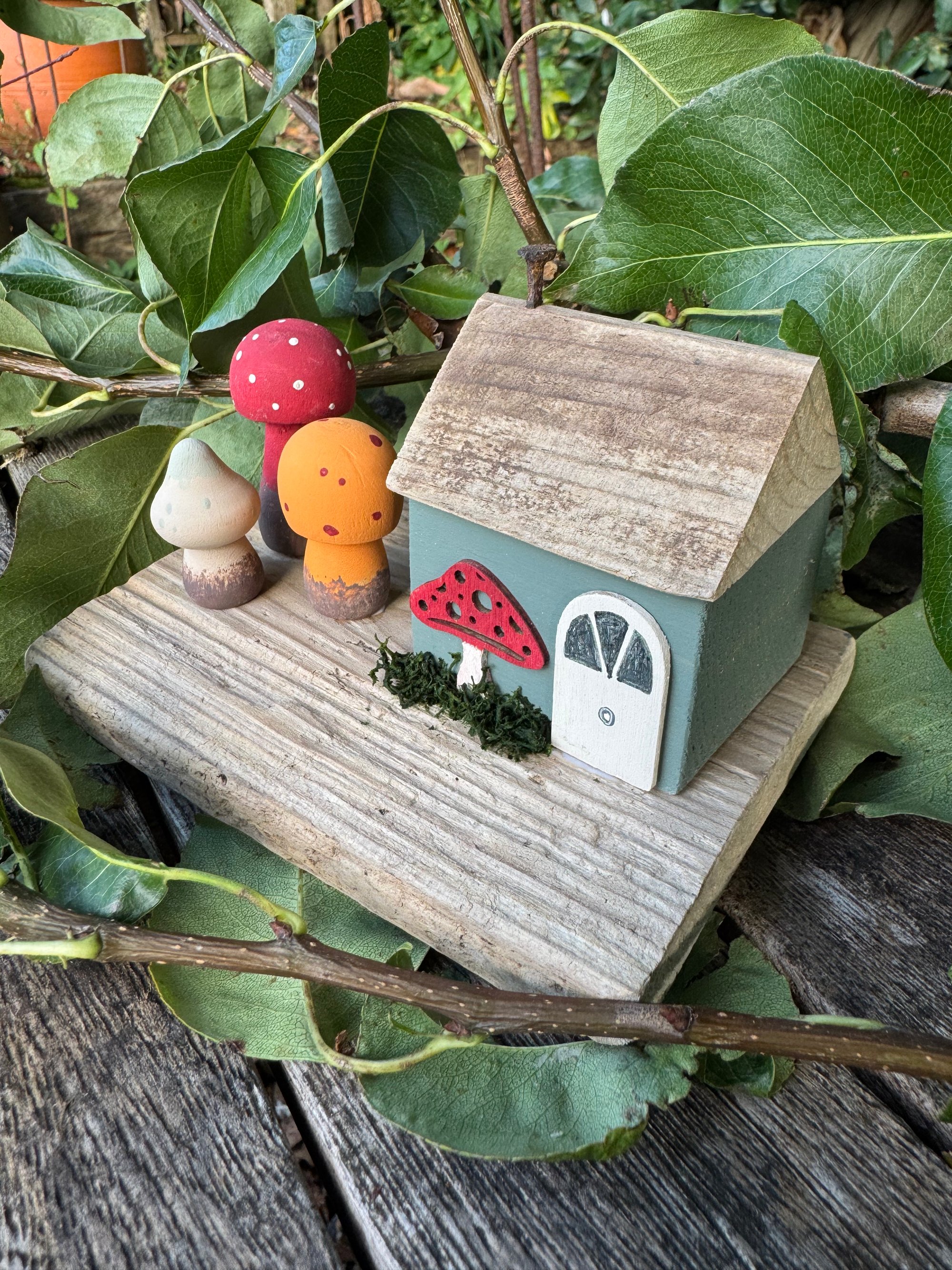 Tiny woodland cottage with magical toadstools on the doorstep!