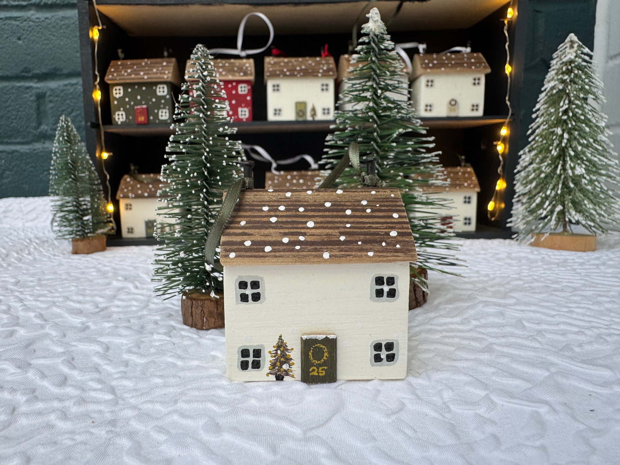 Pretty snowy cottage to hang on your tree. They’re handmade and can be painted in any colour. Tiny snowflakes and a door wreath set the scene for a beautiful, white Christmas!