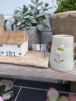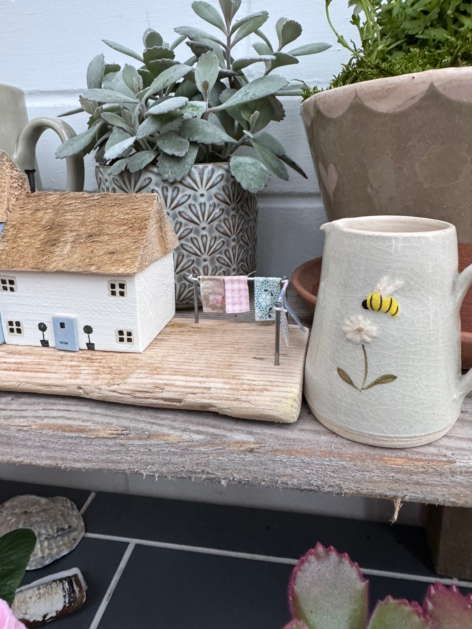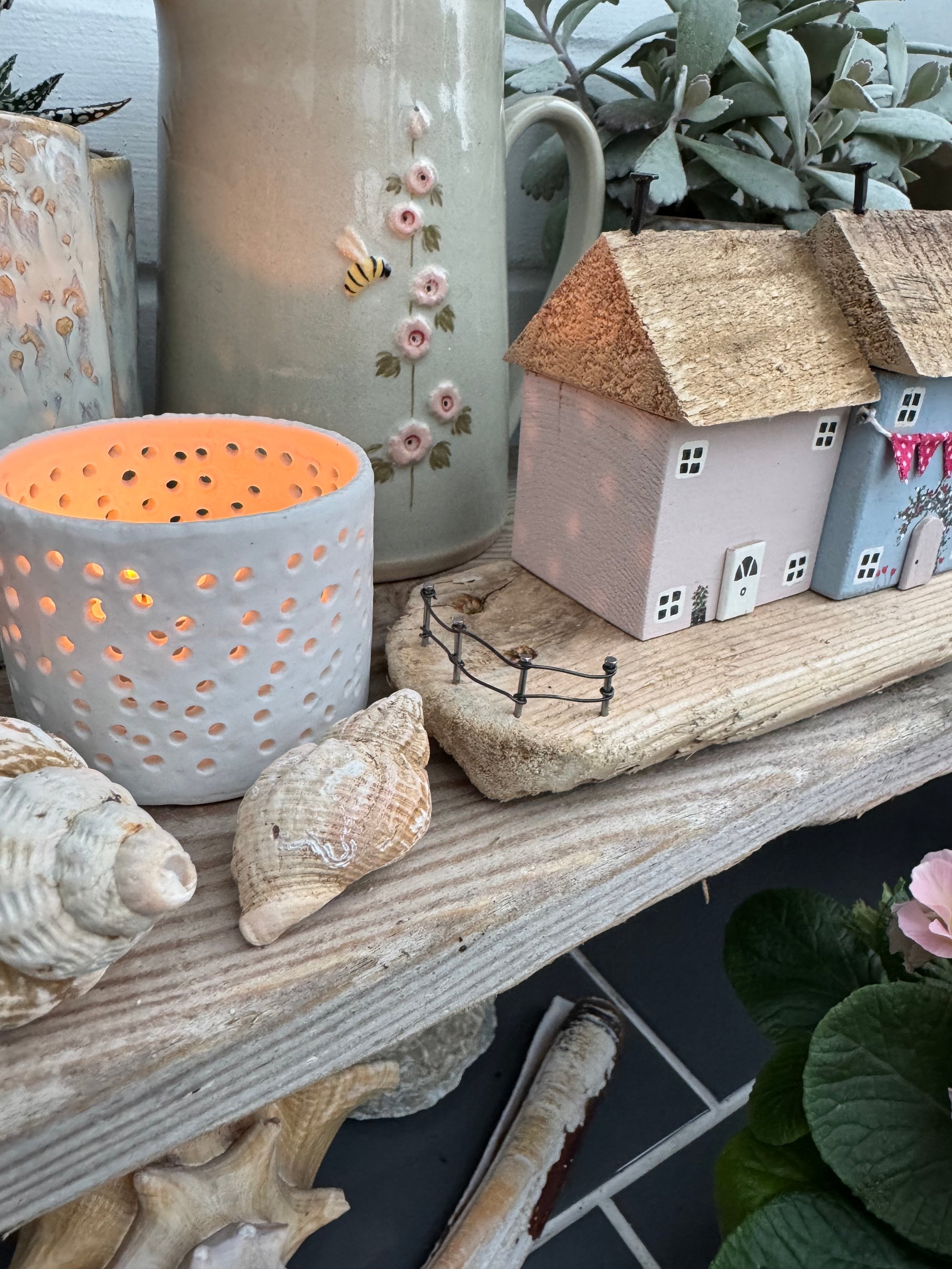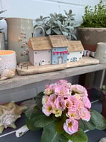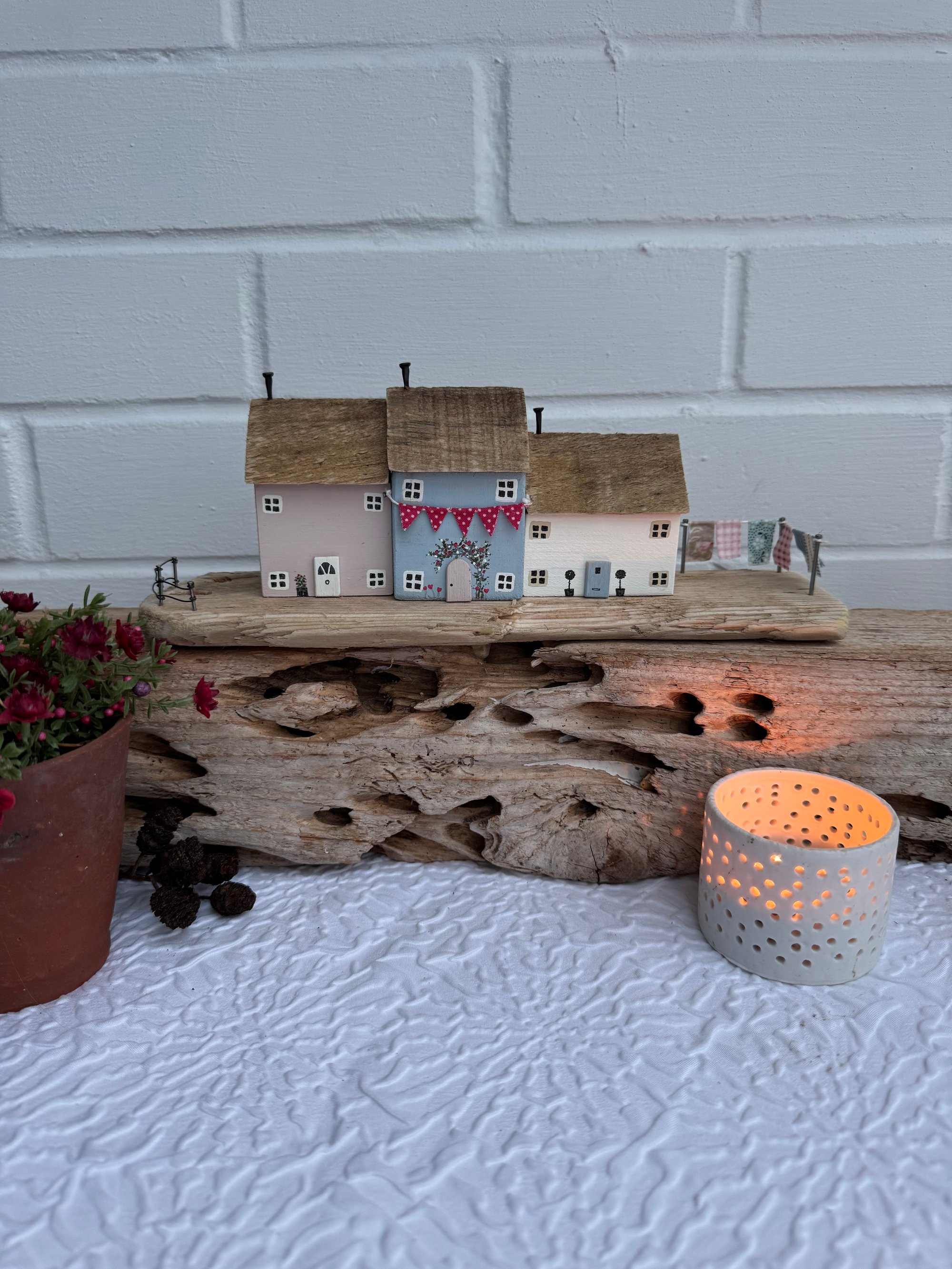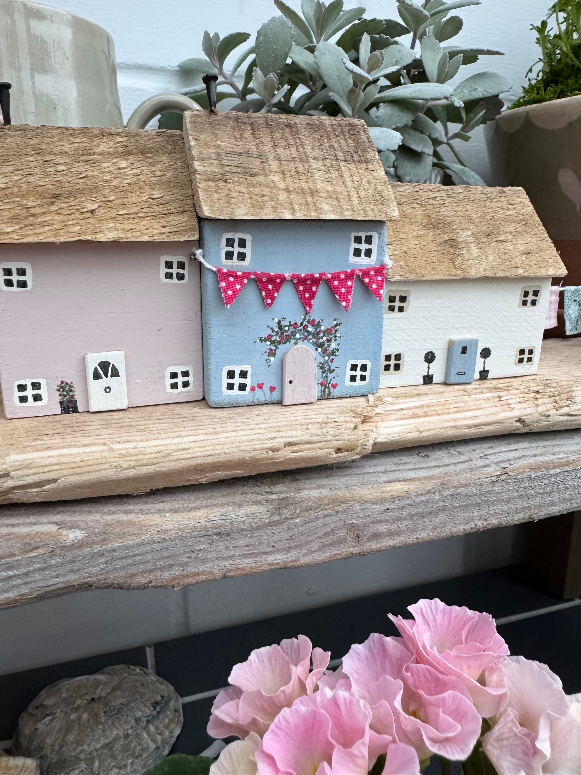 Three pretty cottages on a driftwood base with mini bunting, roses round the door, topiary trees and a fence in pale pink, blue and cream