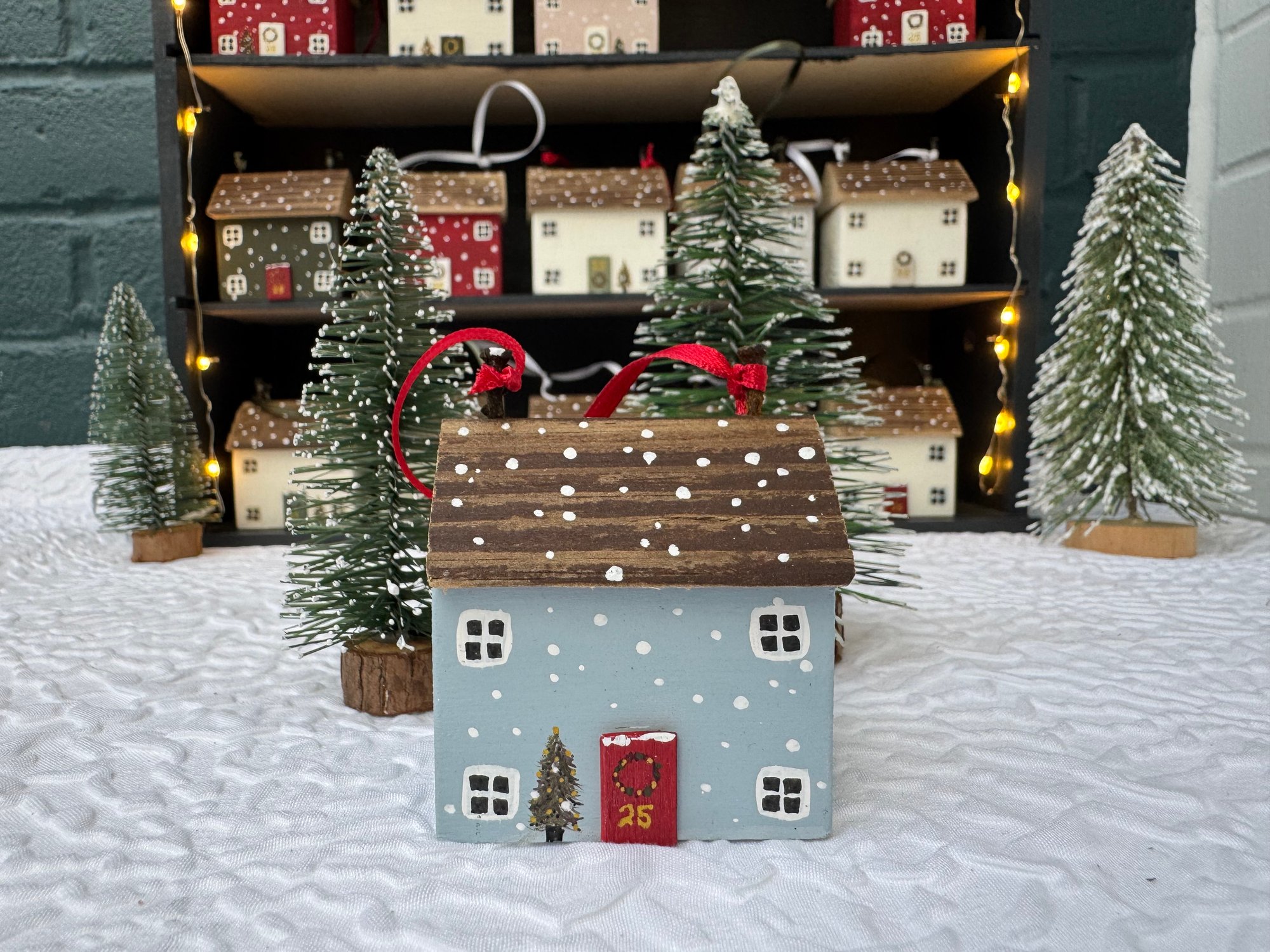 Pretty snowy cottage to hang on your tree. They’re handmade and can be painted in any colour. Tiny snowflakes and a door wreath set the scene for a beautiful, white Christmas!