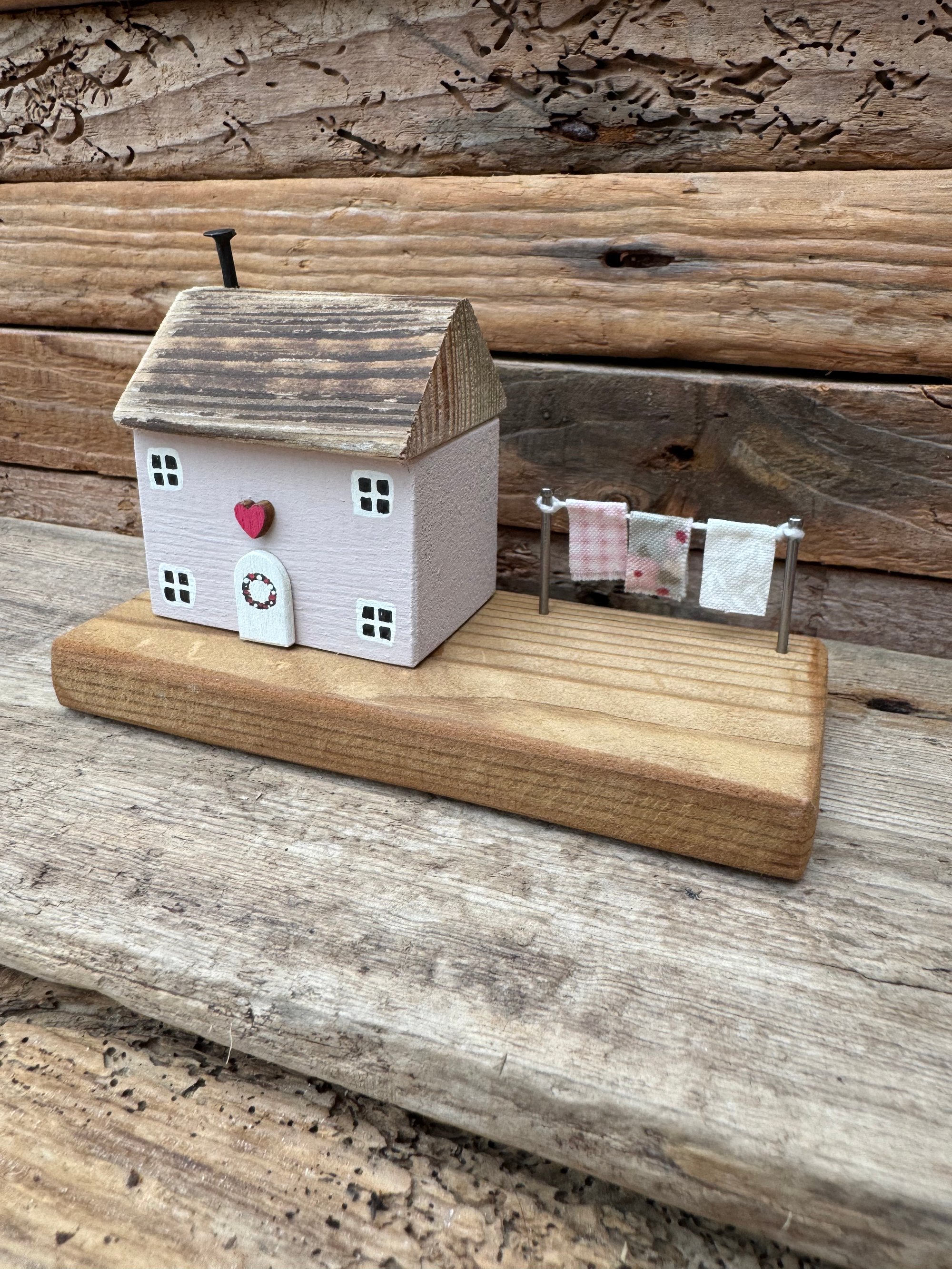 Pale pink cottage with bright pink heart over the front door and a pretty washing line
