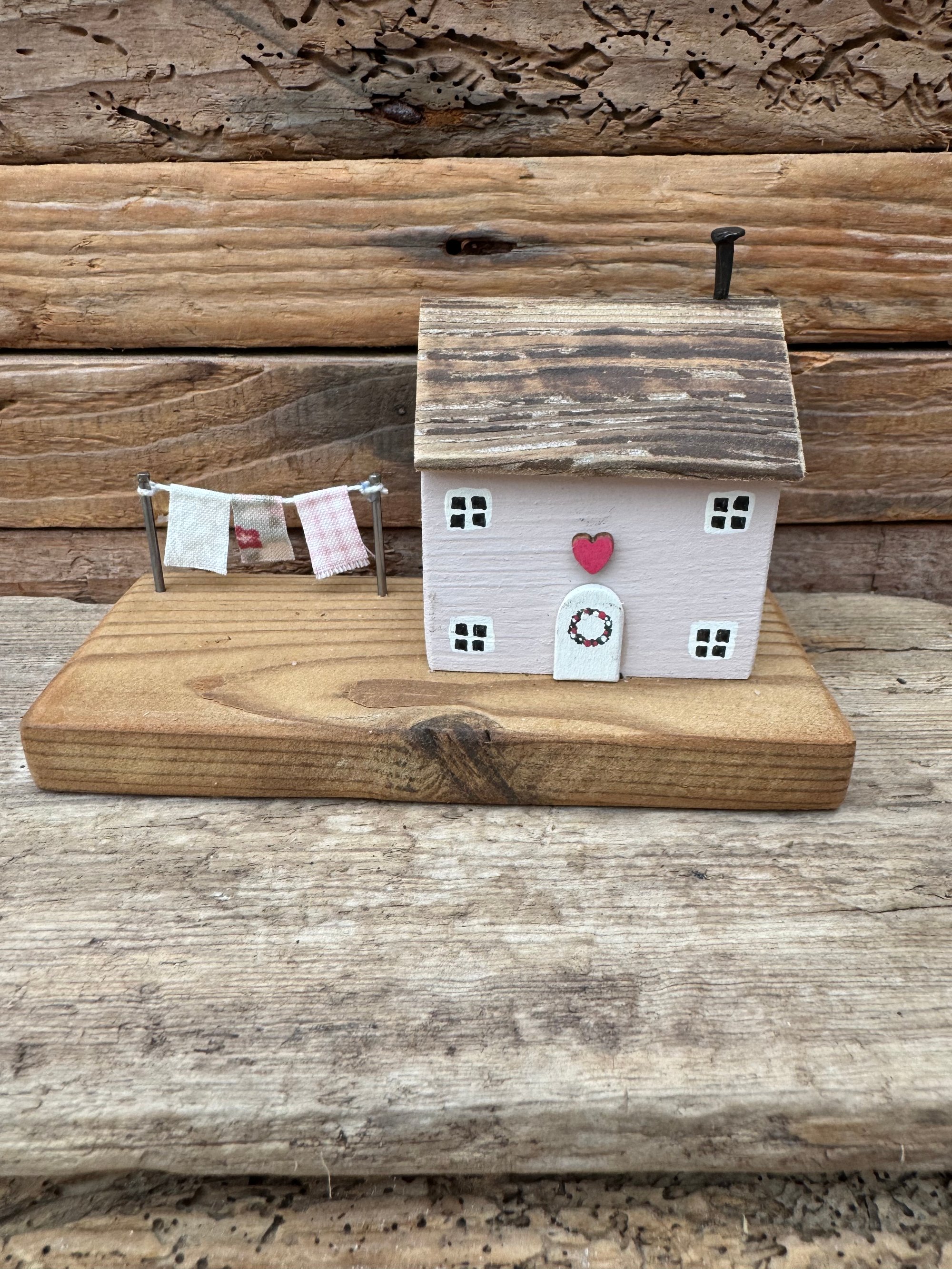 Pale pink cottage with bright pink heart over the front door and a pretty washing line