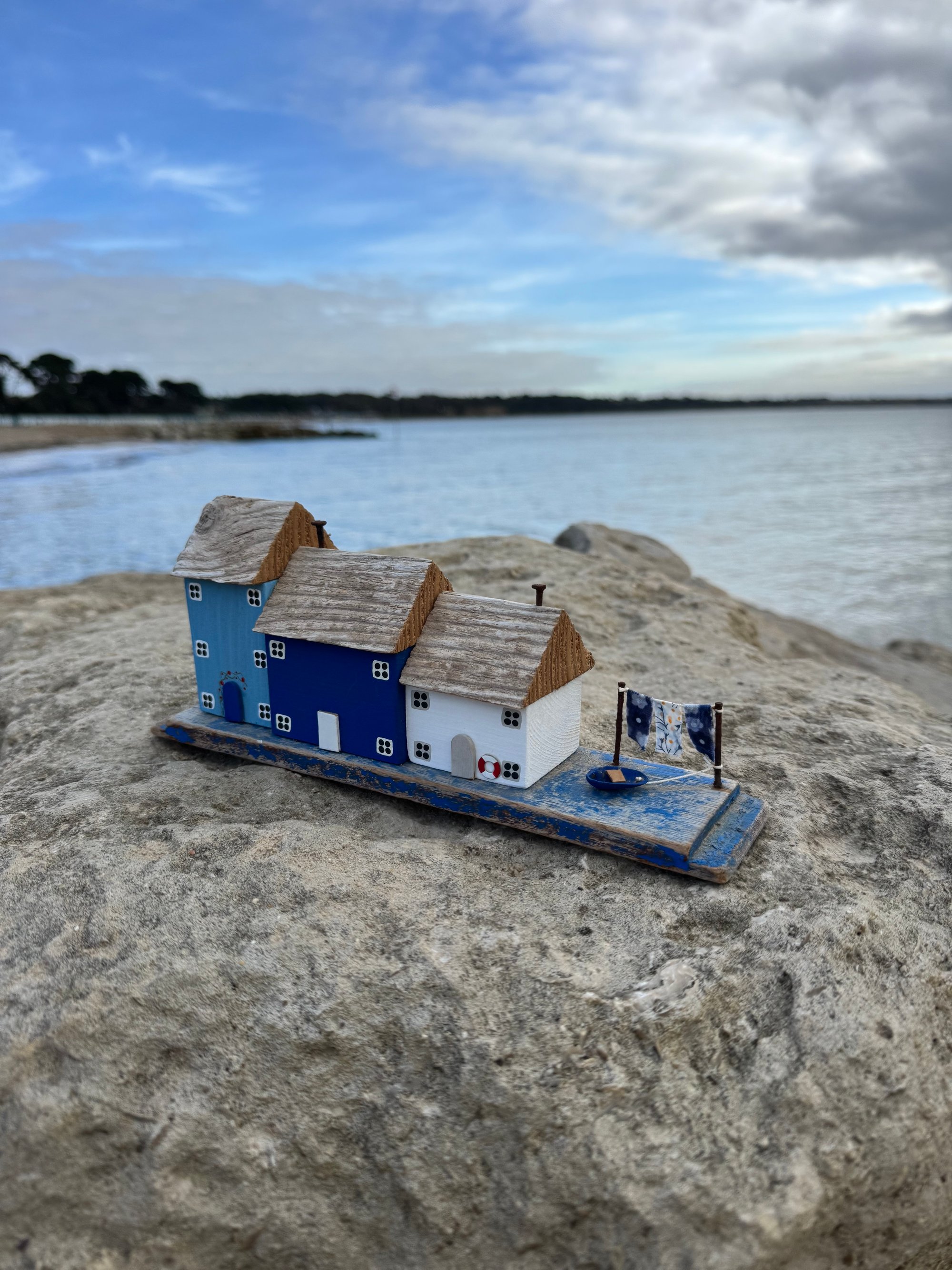 Three cottages nestle on a beautiful, blue base I found on holiday in Turkey. There’s a tiny dinghy, pretty towels drying on the washing line, roses round the door and a lifebelt